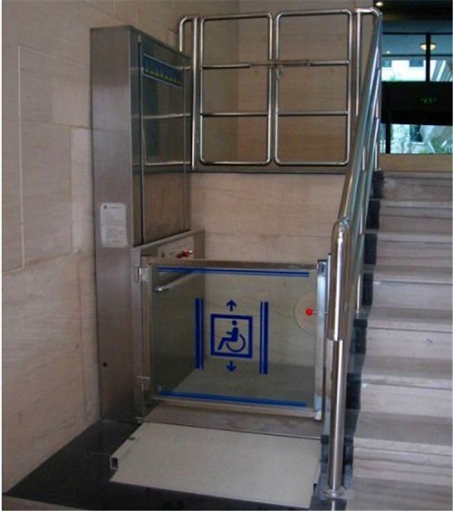無障礙殘疾人升降機,主要是由導軌和升降平臺板組成的,類似一個簡易的小電梯。導軌是鑲嵌在通道出入口的墻壁上的,隨著樓梯的坡度向下延伸,一直到地道內部。而升降平臺在不使用時可以折疊靠著墻壁放置,這樣不會占用通道出入口處的空間。乘坐輪椅的殘疾人在使用時,輪椅四個輪子可以被固定在臺板上,按動開關后就可以控制升降平臺進入地下通道,安全方便。