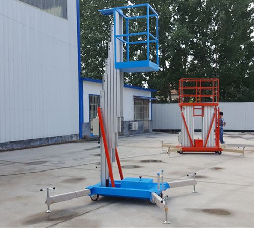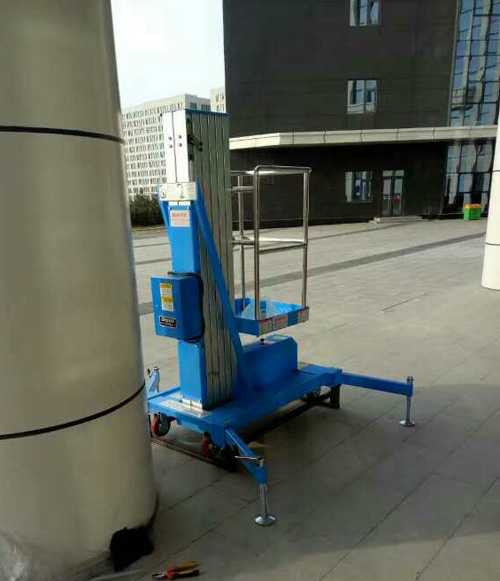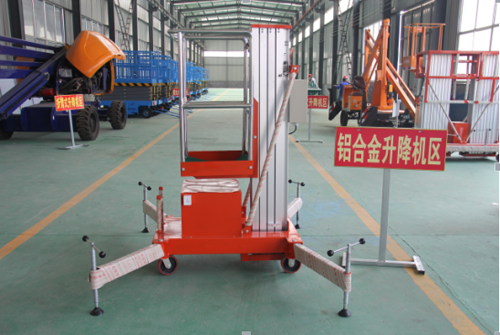 鋁合金升降機升高高度在8米以下為單跪柱式,在10米到14米之間為雙跪柱式,15米到18米之間則升為三跪柱式或四跪柱式。通過升降平臺跪柱的增加達到設備在高空的穩定性,保證作業安全,減小設備晃動的幅度,使高空作業更加平穩。該升降平臺配備了中德合資的液壓泵站,該泵站為壓鑄鋁集成閥塊,結構緊湊,系統壓力16MPa,選用進口密封件的精磨高壓液壓油缸作為主要升降動力,經過液壓泵站帶動鏈條傳動,結構合理,設計緊湊。鋁合金式液壓升降平臺下降速度可自調,而且設備設有手動下降裝置,保證在停電時的正常工作;設有應急停運按鈕;臺面設有防滑絕緣扣板,更換方便,易于清潔,維修方便,有效保障工作安全可靠,保證使用人員的安全。外形美觀,整體輕盈,能在小的空間內發揮好的舉升功能,也可根據客戶要求加裝蓄電池以滿足客戶工作場地的不同要求。